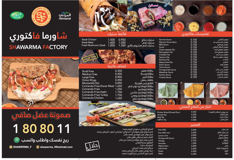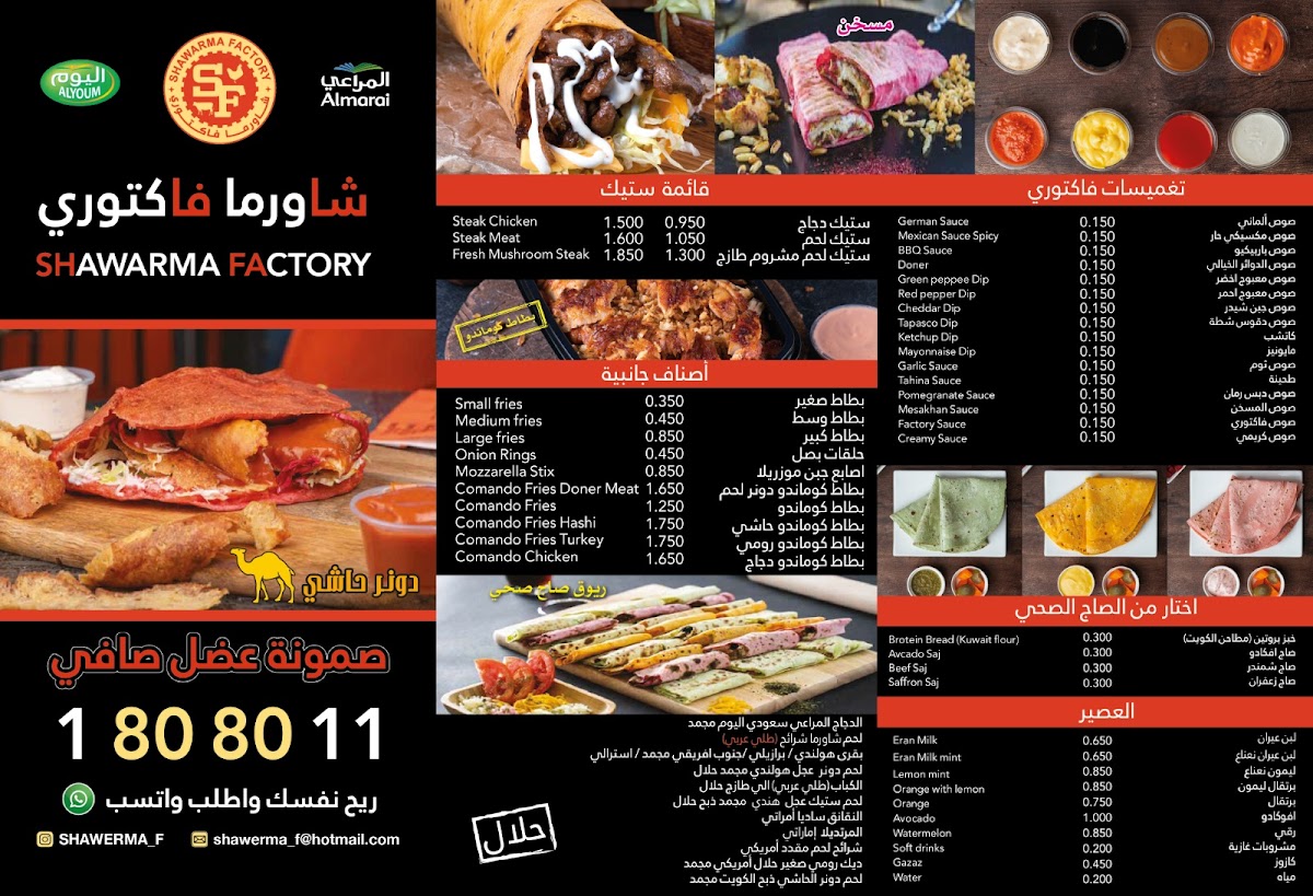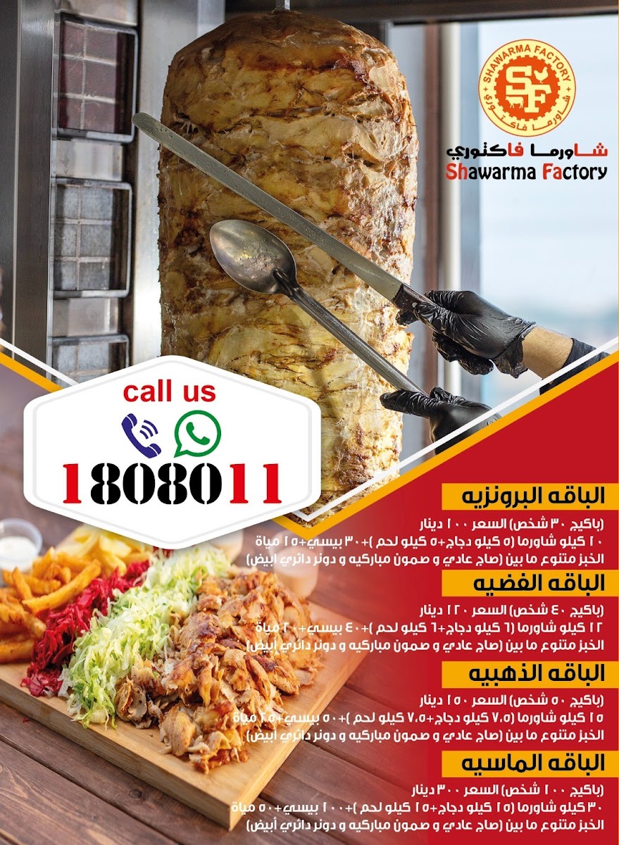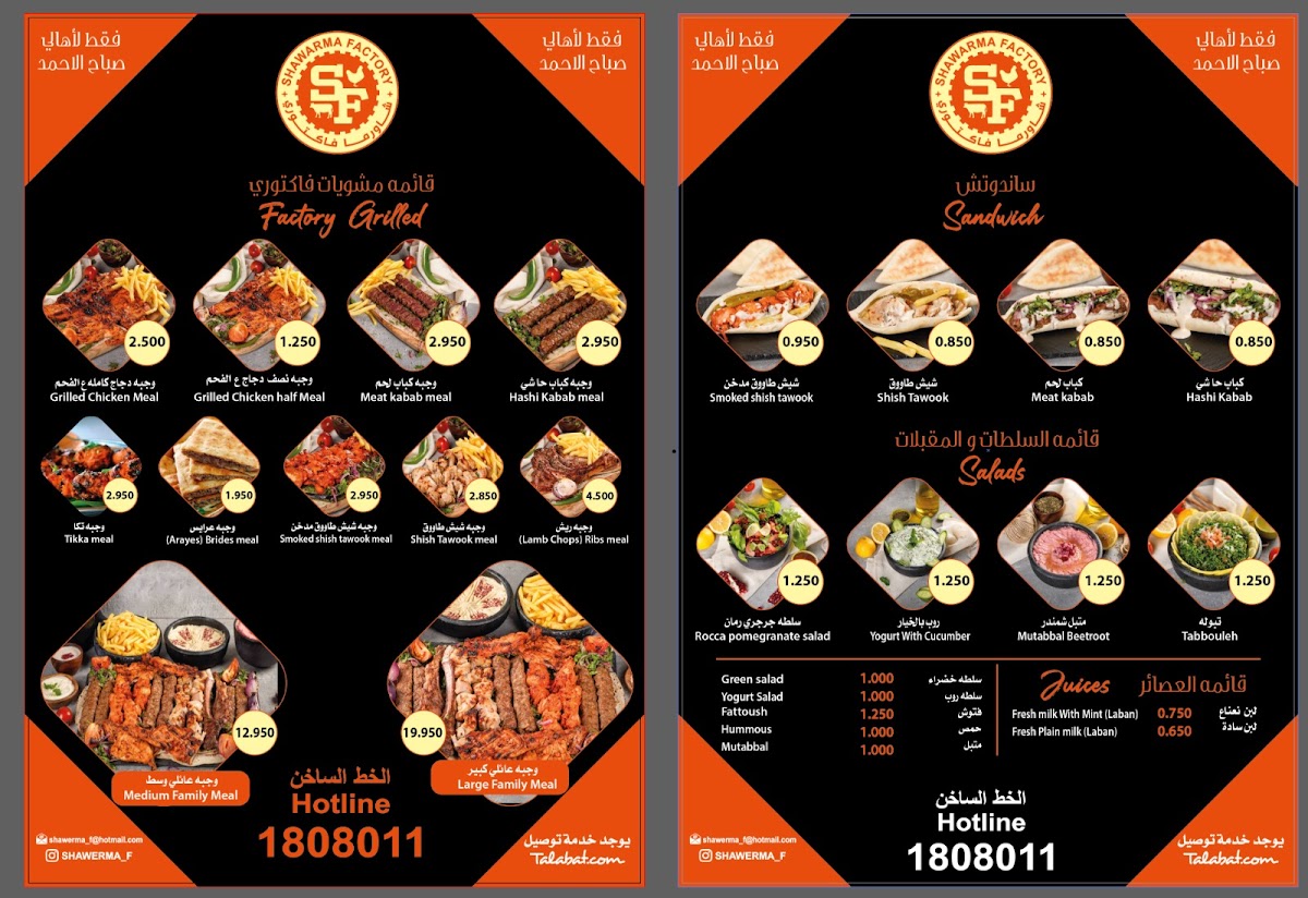 The menu at Shawarma Factory, located at عمرو بن العاص Amro Bin Al-Aas St., Salmiya, Kuwait, offers a delightful array of flavorful options that cater to a variety of tastes. One standout dish is the Shawarma Sandwich, which is a classic favorite, featuring tender, spiced meat wrapped in a soft pita bread. For those looking for something more filling, the Chicken Filet Saj is a great choice-grilled chicken fillets wrapped in Saj bread, creating a perfect blend of crispy and tender textures.